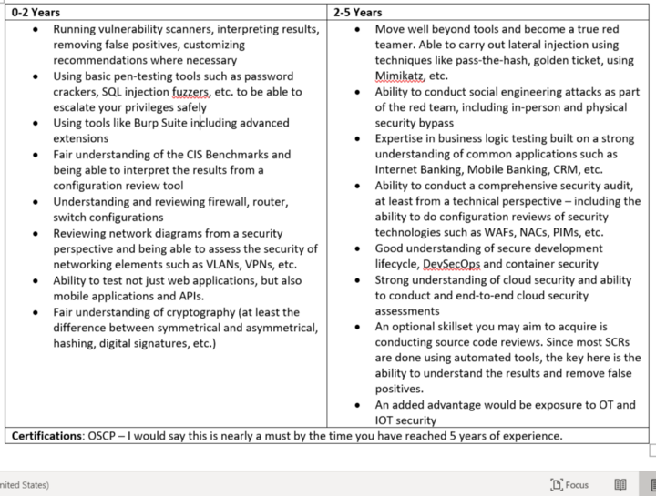 After a couple of years doing vulnerability assessments and penetration testing (VAPT) projects, you would have acquired a fair bit of skill in using the right tools, interpreting their results and using limited exploitation techniques to penetrate deeper into systems. You may even have, once in a while, gained Domain Admin access within the network you were testing. However, you would typically struggle to get that level of success within a hardened environment. Here’s a summary of where you should be at this stage and where you should aspire to get to in the next two years of your career: