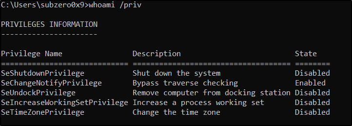 As we can see here only the SeChangeNotifyPrivilege is enabled and rest of the privileges which are assigned to the user are disabled. To use those privileges, we must enable them first.