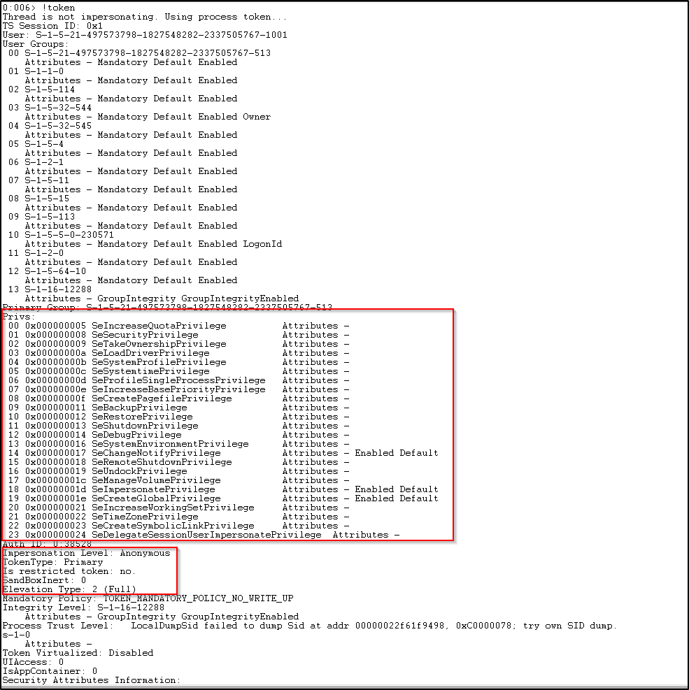 Here, we can see the token is similar to the standard user except the privileges assigned are far more than the standard user, basically, all the privileges are assigned to the administrator user. Also, we can see the Elevation Type here is 2 (Full) which states that it is an elevated token with no privileges and groups stripped down.